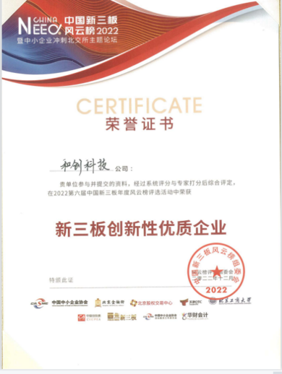 在2022年第六屆中國新三板年度風云榜活動中和創科技榮獲“新三板創新性優質企業”