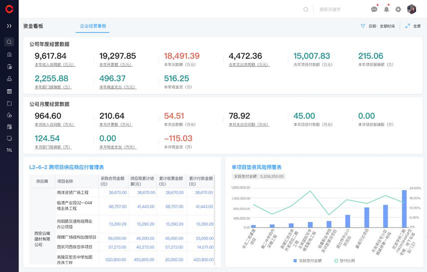 紅圈解決方案:紅圈系統(tǒng)具備全面的資金管理解決方案,通過系統(tǒng),老板能夠及時、準(zhǔn)確地知道公司每個在建項目的應(yīng)收和實收情況、供應(yīng)商的結(jié)算情況,以及過程資料是否有缺失,從而評估是否可能產(chǎn)生額外墊資,判斷對下付款是否有必要做壓款,項目墊資是否存在風(fēng)險。財務(wù)也可以通過數(shù)據(jù)來判斷風(fēng)險,給到老板更好的建議。