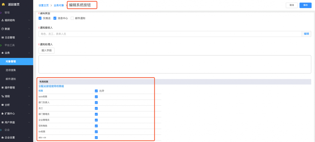 - 系統字段及按鈕修改權限配置:系統字段、標準字段(所屬部門及負責人)、按鈕支持在編輯時修改權限