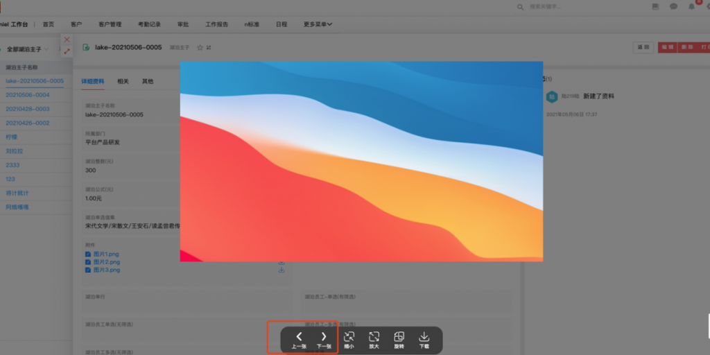 - 附件字段中的圖片預覽時可上下切換:附件字段中詳情頁的圖片在預覽時可以上下切換