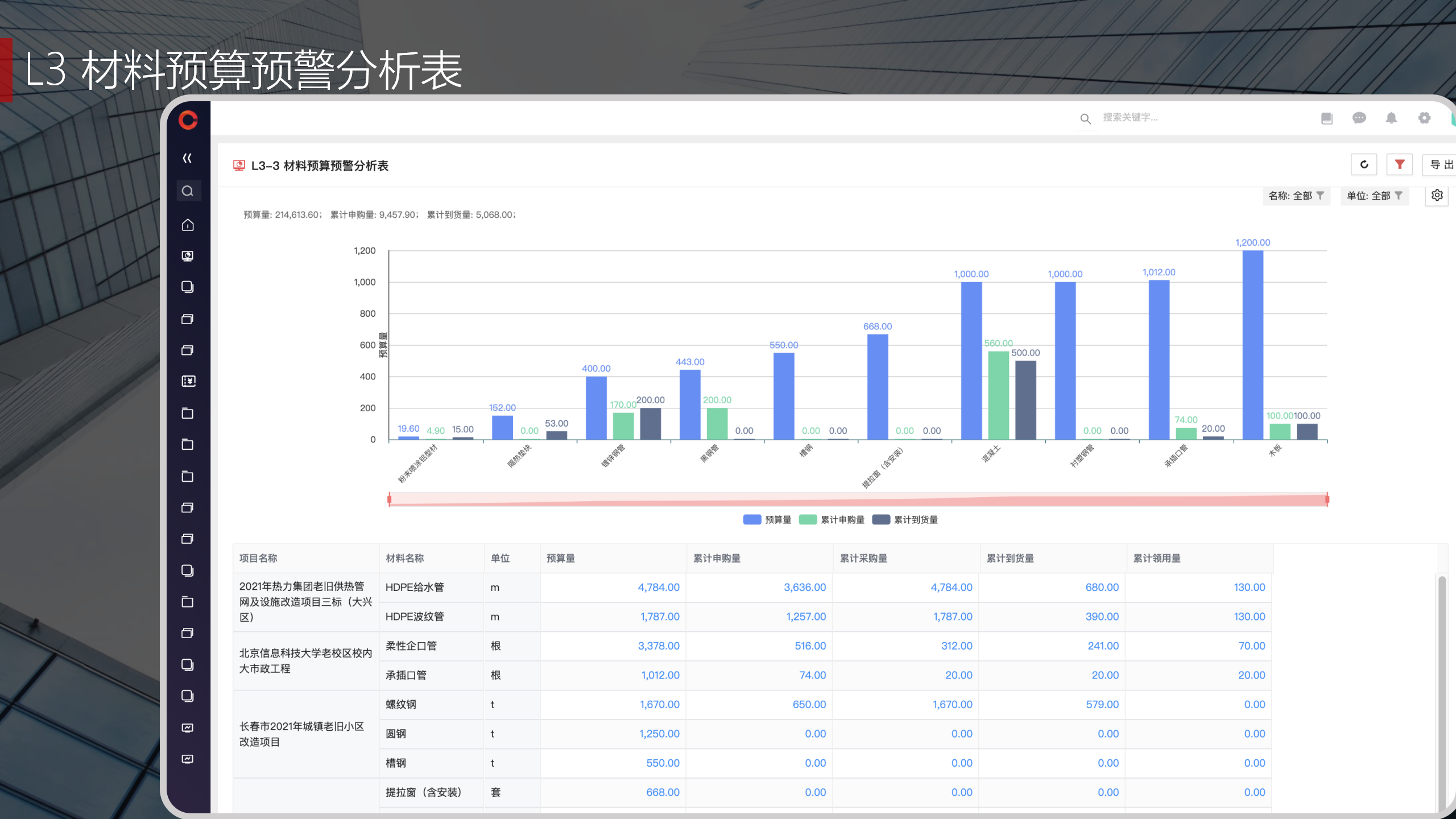 紅圈系統(tǒng)在PaaS平臺基礎上,根據(jù)工程項目管理的實際情況,通過人力資源管理、資金管理、成本管理、物資管理、安全質量管理、招投標管理、合同管理、勞務管理等功能模塊,利用報表引擎實時動態(tài)抓取項目管理過程中的相關數(shù)據(jù),實時動態(tài)展現(xiàn)公司整體項目運營情況。當某項科目設定額度一旦超出計劃指標時,系統(tǒng)會自動發(fā)送動態(tài)預警。為公司領導決策實時呈現(xiàn)動態(tài)智能數(shù)據(jù)分析,讓公司領導實時了解工程項目的整體運營效率及效益是否達標,經(jīng)營風險是否可控,真正做到項目管理心中有“數(shù)”,滿足公司對信息化管理的需求,提升公司經(jīng)營管理能力,實現(xiàn)工程項目全過程管理的降本增效。