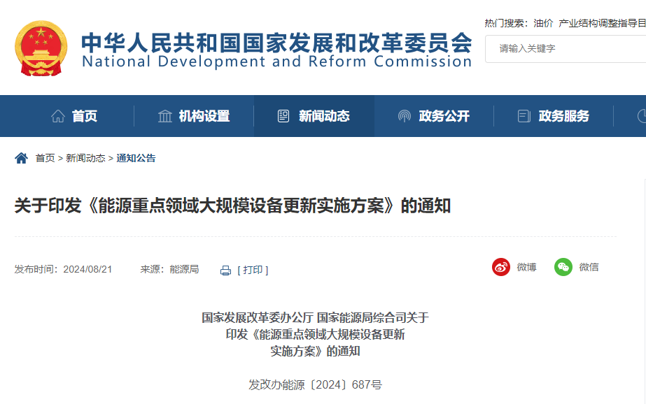 8月21日,國家發(fā)改委辦公廳與國家能源局綜合司攜手發(fā)布了《能源重點領域大規(guī)模設備更新實施方案》,該方案設定了雄心勃勃的目標:至2027年,能源關鍵領域的設備投資規(guī)模將較2023年實現(xiàn)25%以上的顯著增長。這一戰(zhàn)略部署旨在通過“三改聯(lián)動”——煤電機組的節(jié)能、供熱及靈活性改造,以及輸配電、風電、光伏、水電等領域的設備更新與技術革新,全面推動能源行業(yè)的轉型升級。